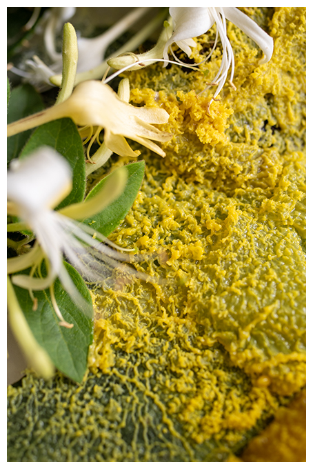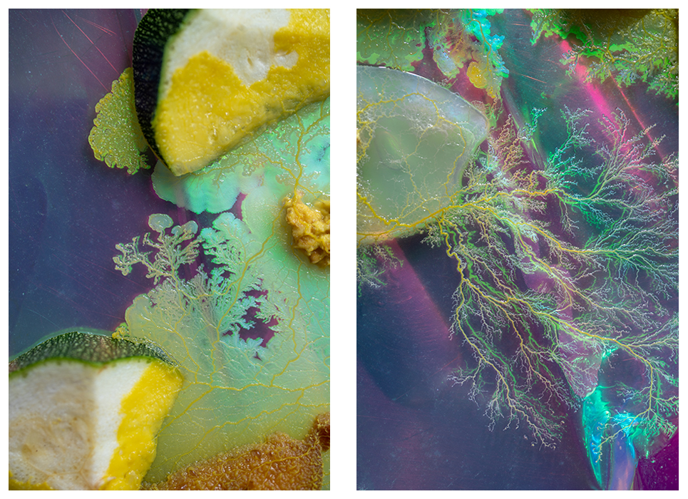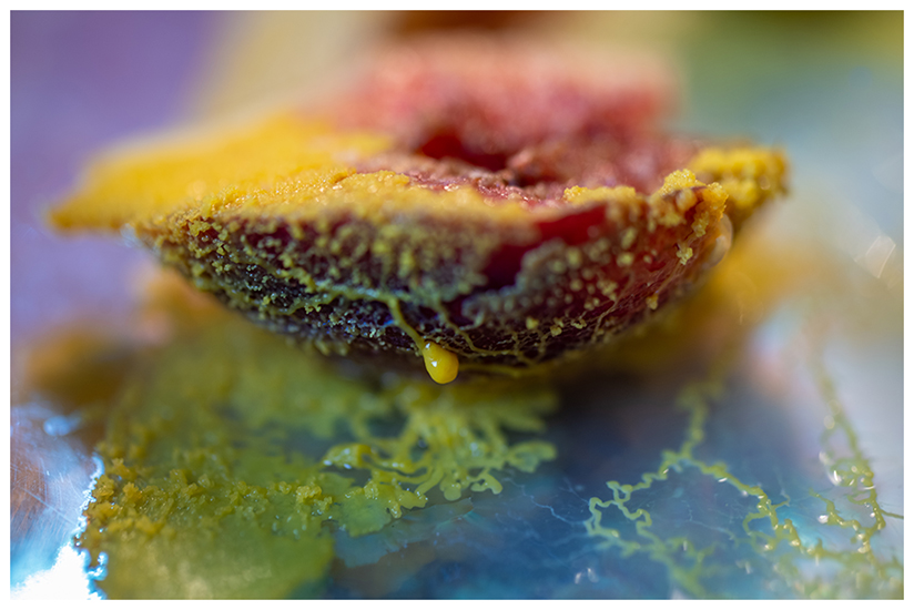Issue de cultures réalisées à mon domicile dans des environnements spécifiques conçus pour l'exposition, la prise de vue des blobs consiste à suivre au jour le jour les réactions et les évolutions des phisarum polycephalum.